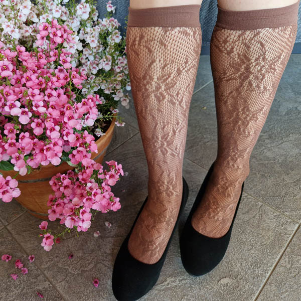 Anyagában mintás női térdzokni BARNA (virág minta)