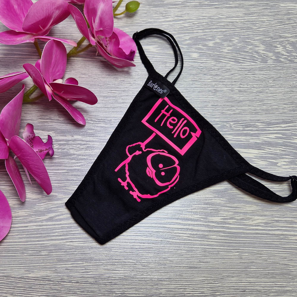 Barones állítható pántos pamut tanga „HELLO CSIBE MINTÁS” fekete-pink színben. Magyar készítésű fehérneműk széles választéka egy helyen! Egyméretes állítható pántos mai divatmintás női fehérnemű. Keresd színeit és mintáit.