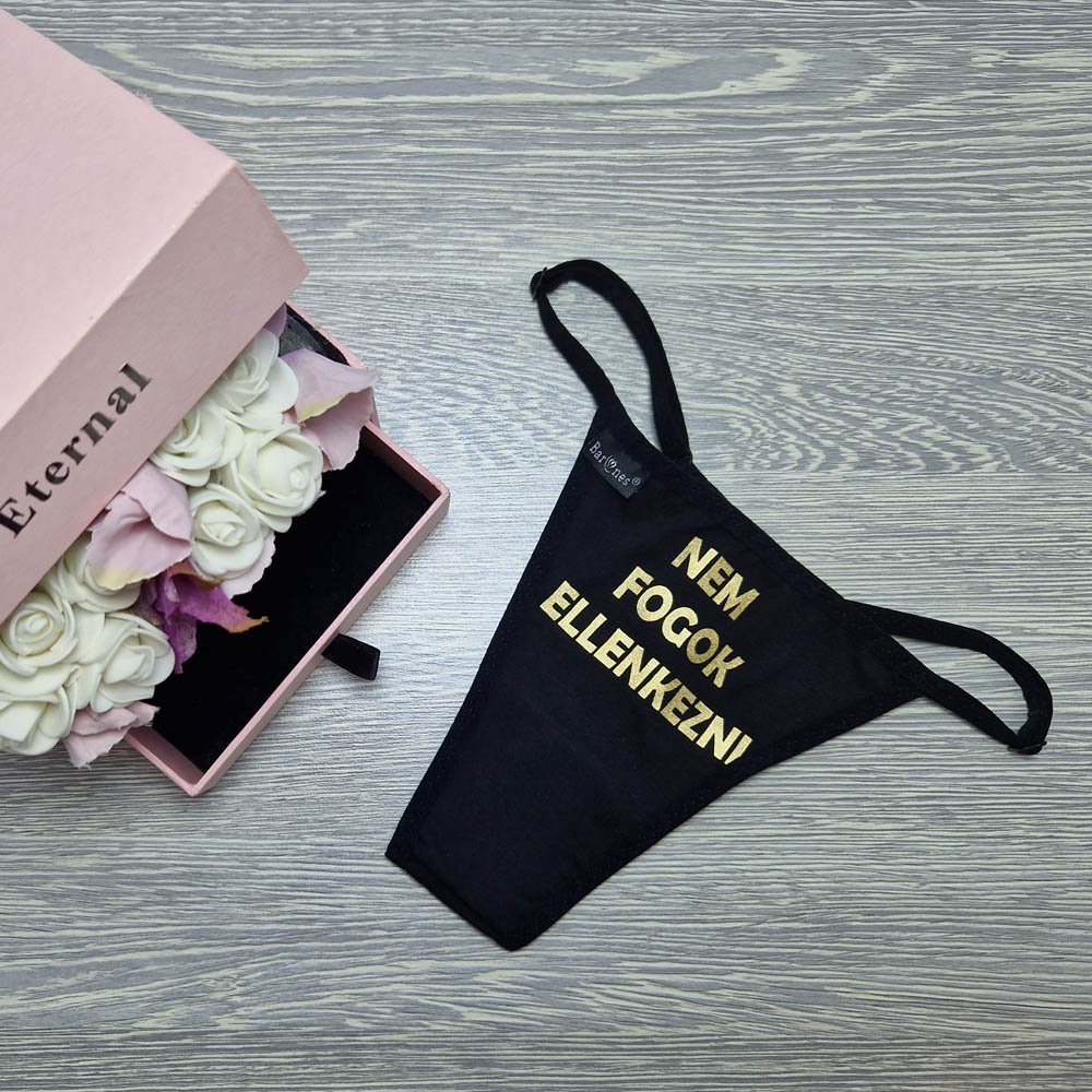Barones állítható pántos pamut tanga „NEM FOGOK ELLENKEZNI” fekete-arany színben. Magyar készítésű fehérneműk széles választéka egy helyen! Egyméretes állítható pántos mai divatmintás női fehérnemű. Keresd színeit és mintáit.