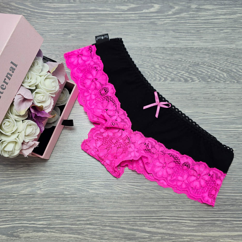 Csipke-pamut brazil csípőtanga FEKETE-PINK csipkés. Magas pamuttartalommal, csipkés szegéllyel, ülepnél pamut betéttel készült brazil csípőtanga. Magyar készítésű fehérneműk széles választéka egy helyen! Mai divatmintás női fehérnemű csipkés változatban!