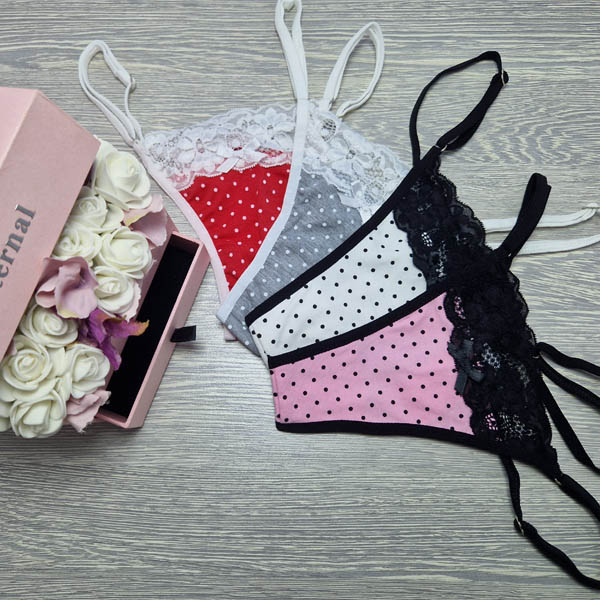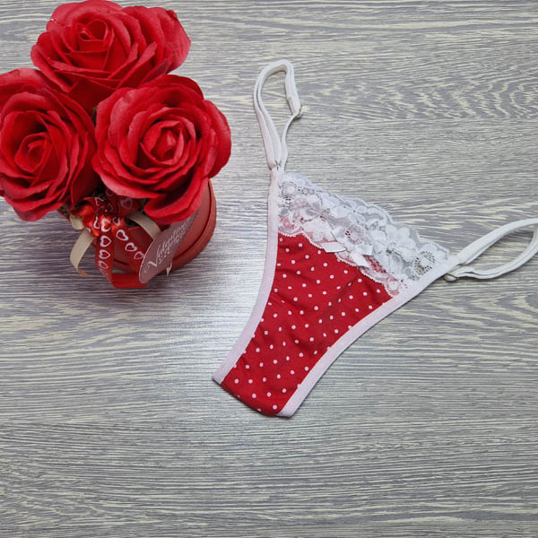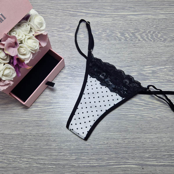 Lucifer állítható pántos PÖTTYÖS PAMUT-CSIPKE TANGA. Magyar készítésű fehérneműk széles választéka egy helyen! Egyméretes állítható pántos mai divatmintás női fehérnemű.