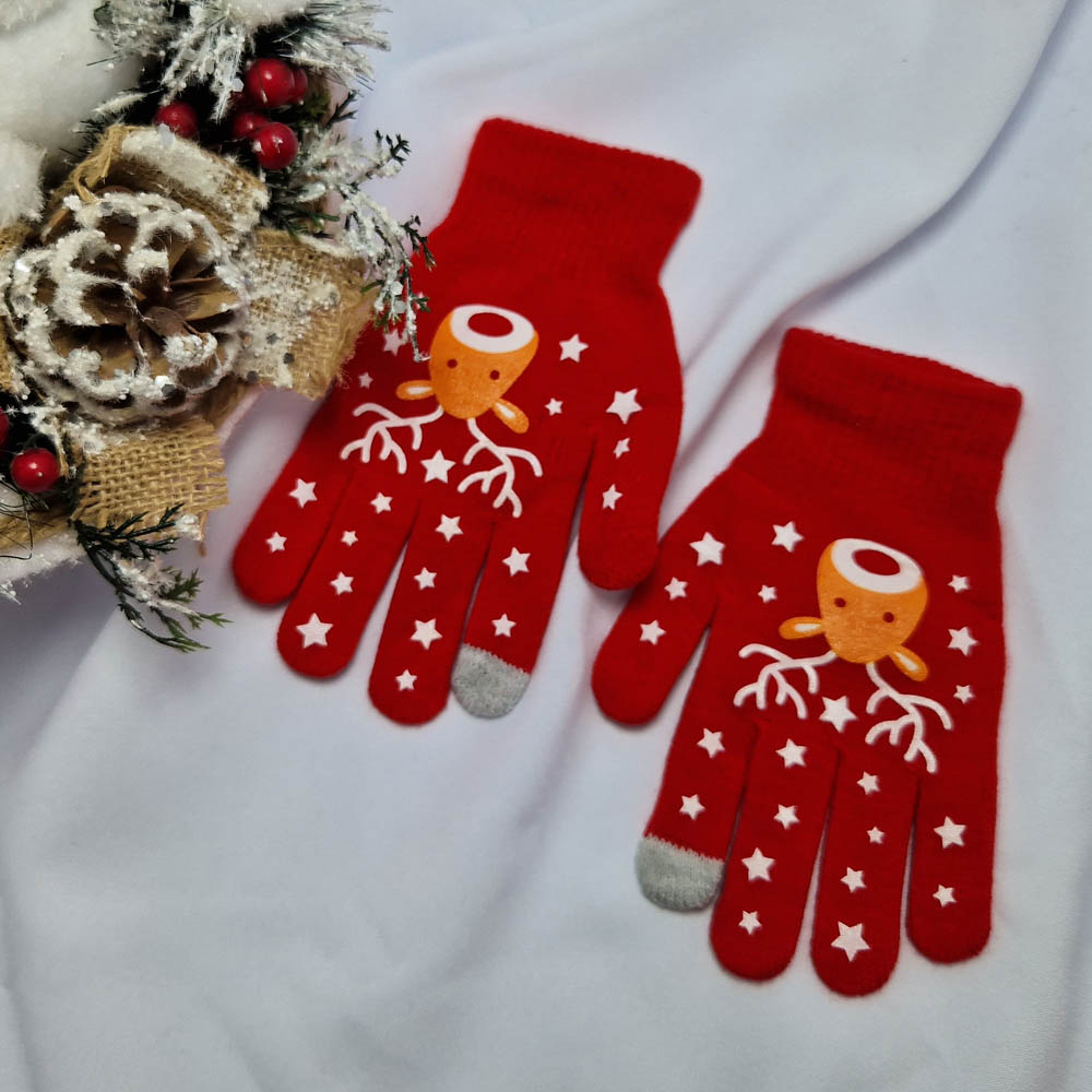 Mikulásos-Karácsonyi 5 ujjas kesztyű érintő képernyőkhöz piros-rénszarvas mintás.