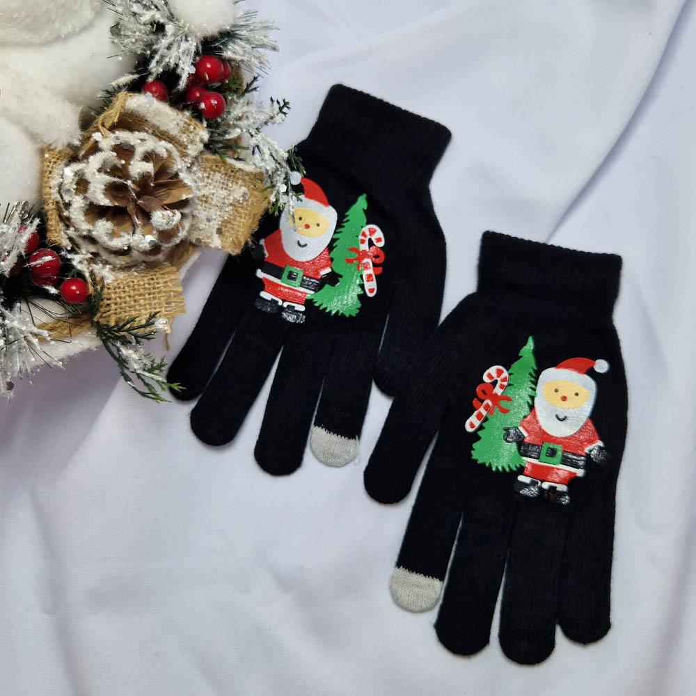 Mikulásos-Karácsonyi 5 ujjas kesztyű érintő képernyőkhöz fekete-mikulásos mintás.