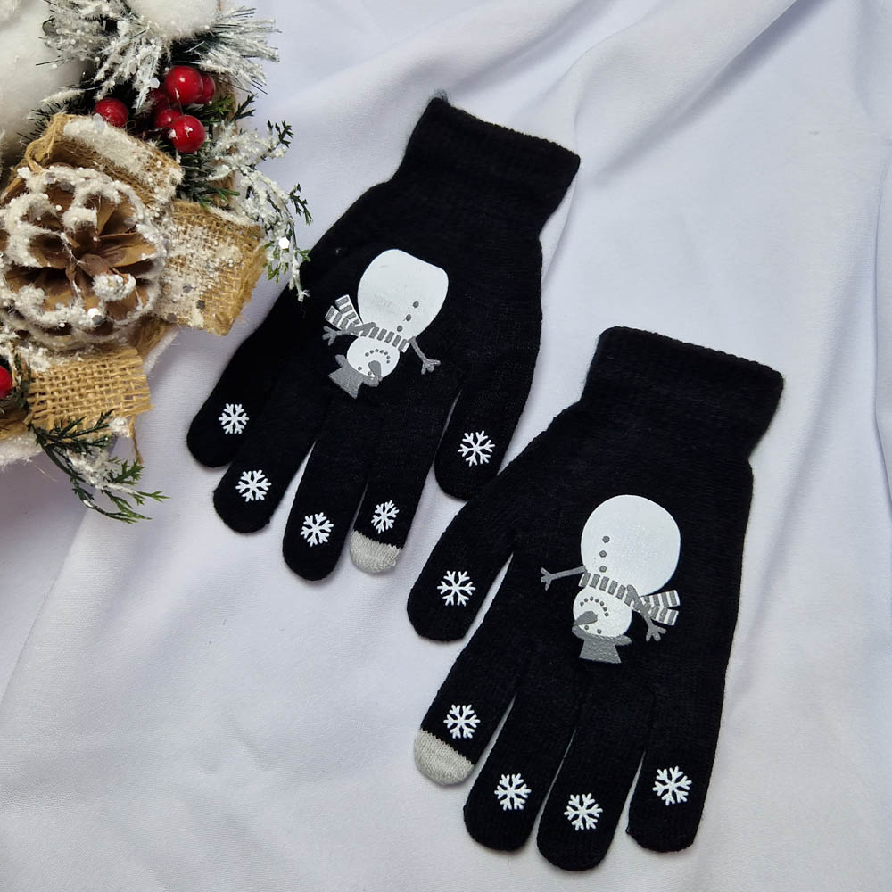 Mikulásos-Karácsonyi 5 ujjas kesztyű érintő képernyőkhöz fekete-hóemberes mintás.