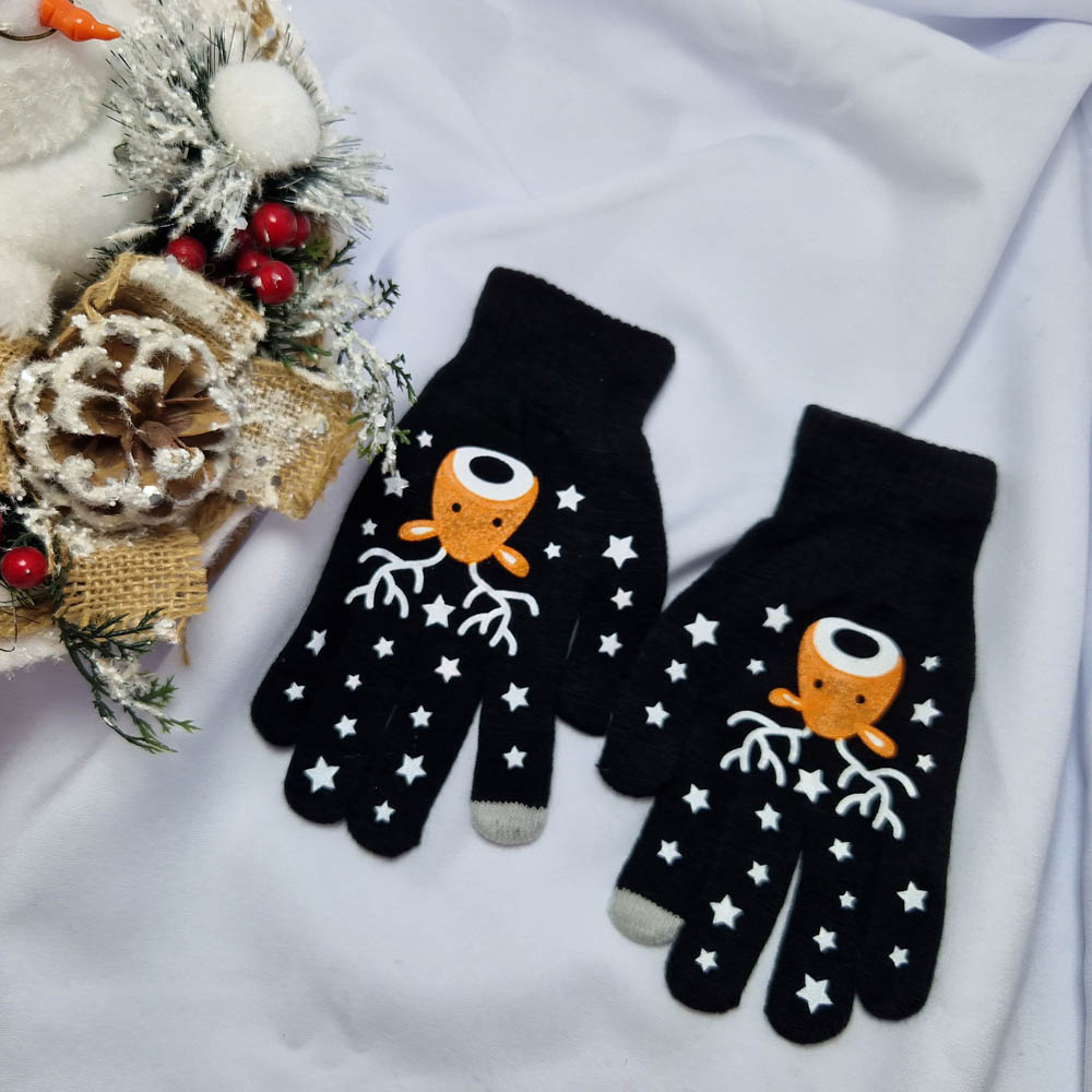 Mikulásos-Karácsonyi 5 ujjas kesztyű érintő képernyőkhöz fekete-rénszarvas mintás.