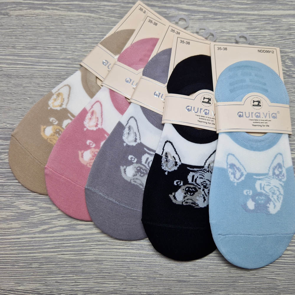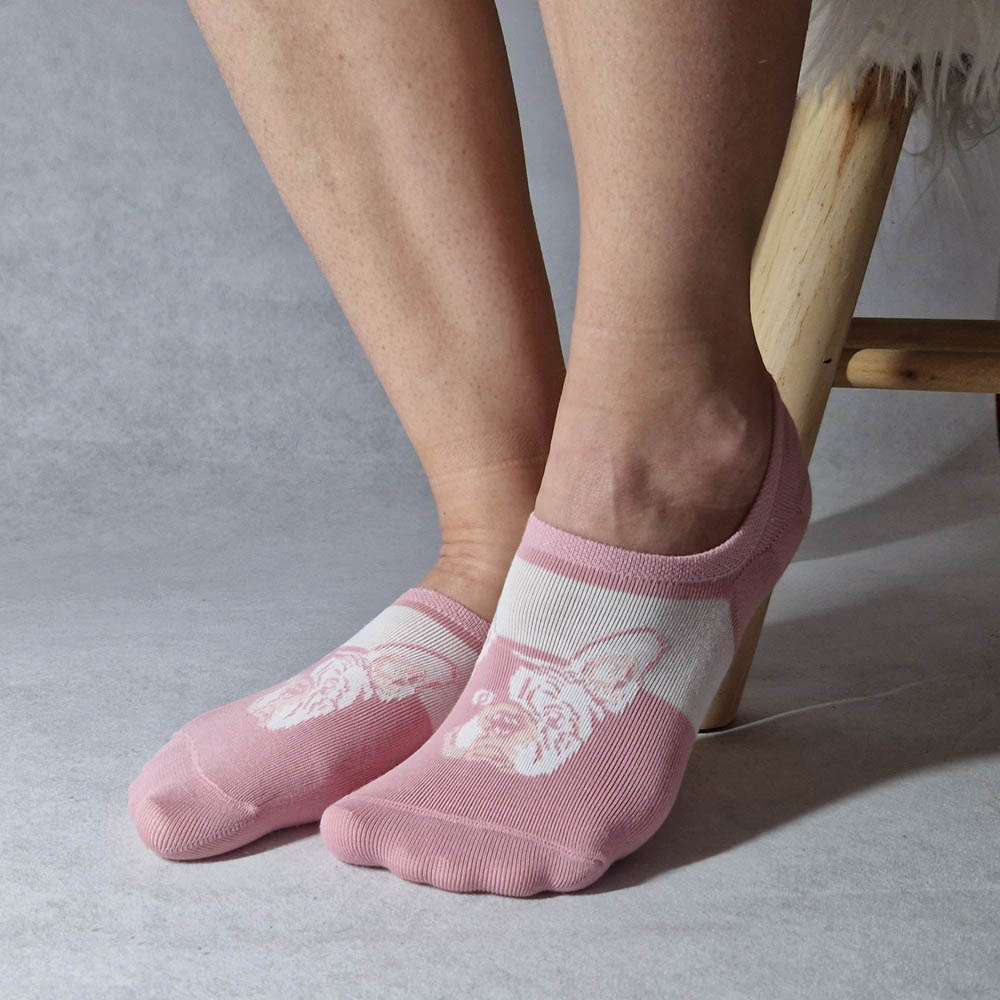 Női titokzokni francia buldog mintás mélyebben kivágott, szilikon sarokrésszel, 5 pár/cs