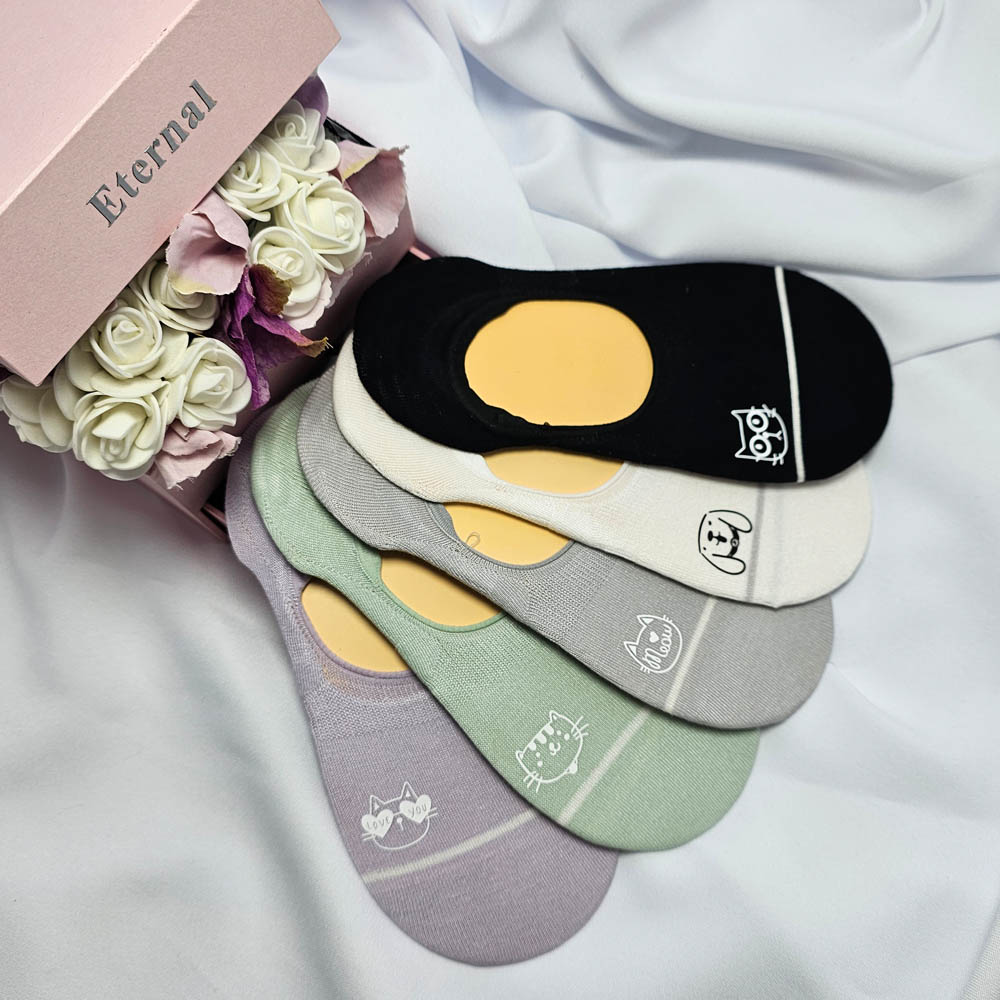 Női titokzokni mélyebben kivágott, cica mintás szilikon sarokrésszel, 5 pár/cs