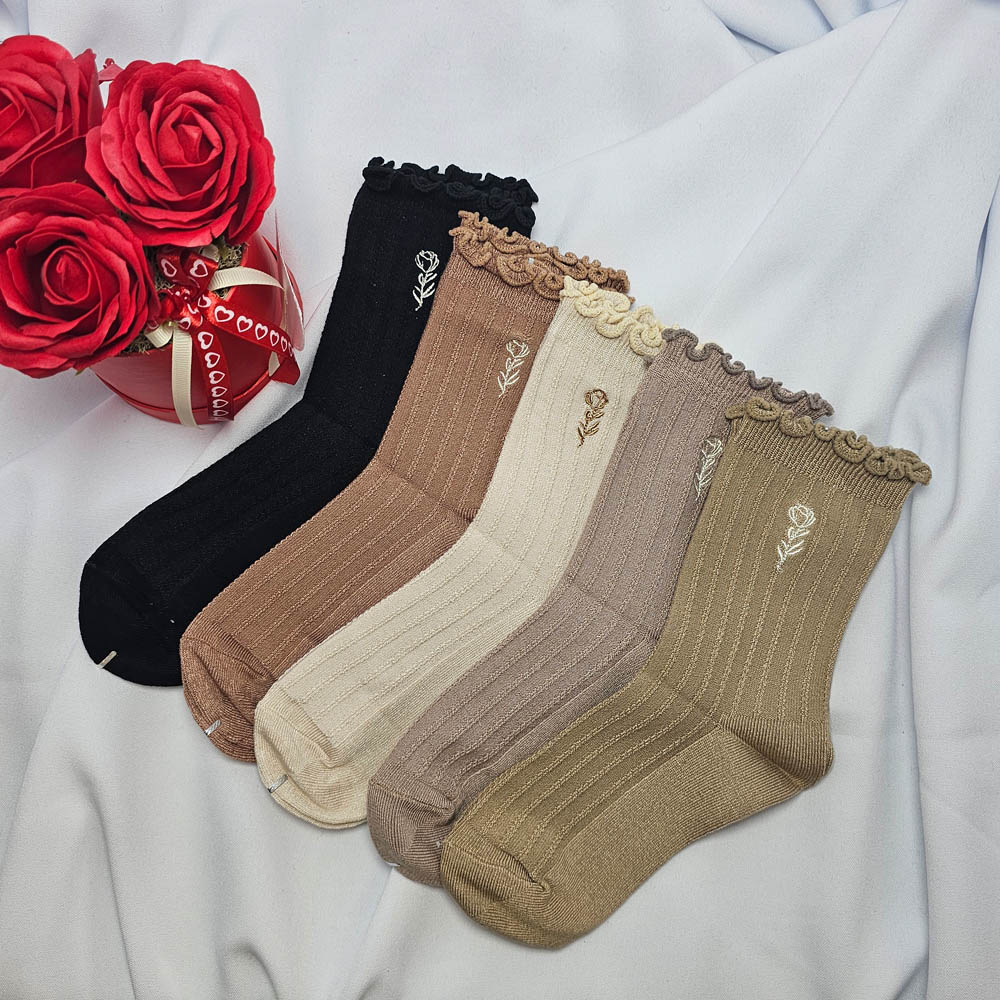 Női zokni fodros szélű hímzett virág mintával 5 pár/csomag!