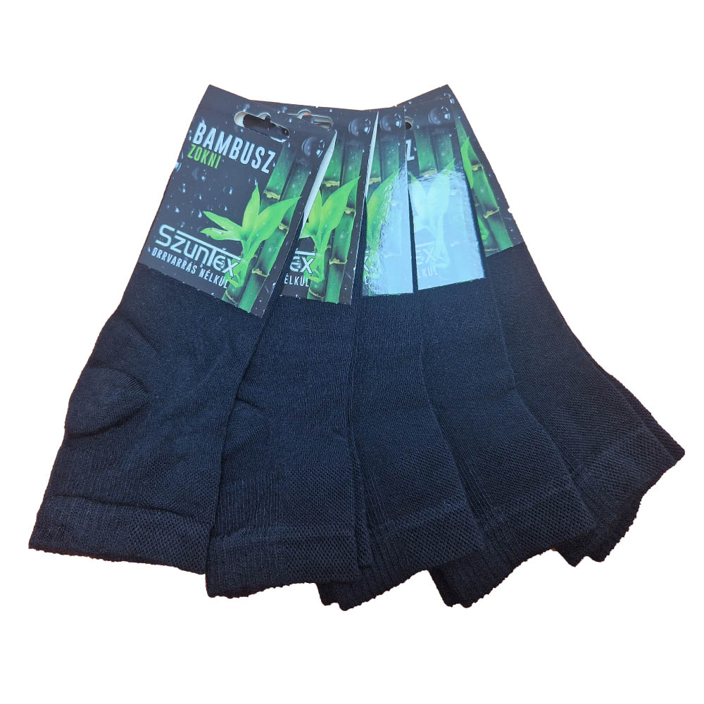 Bambusz köztes szárú zokni (bokacsont tetejéig ér) fekete 5 pár/csomag.  Megérkezett a Szuntex  MAGYAR gyártótól. Antibakteriális hatású, így egészséges és higiénikus a viselete.Kényelmes, tartós, orrvarrás nélküli normál vékony zokni. Ideális minden évszaknak megfelelő használatára.